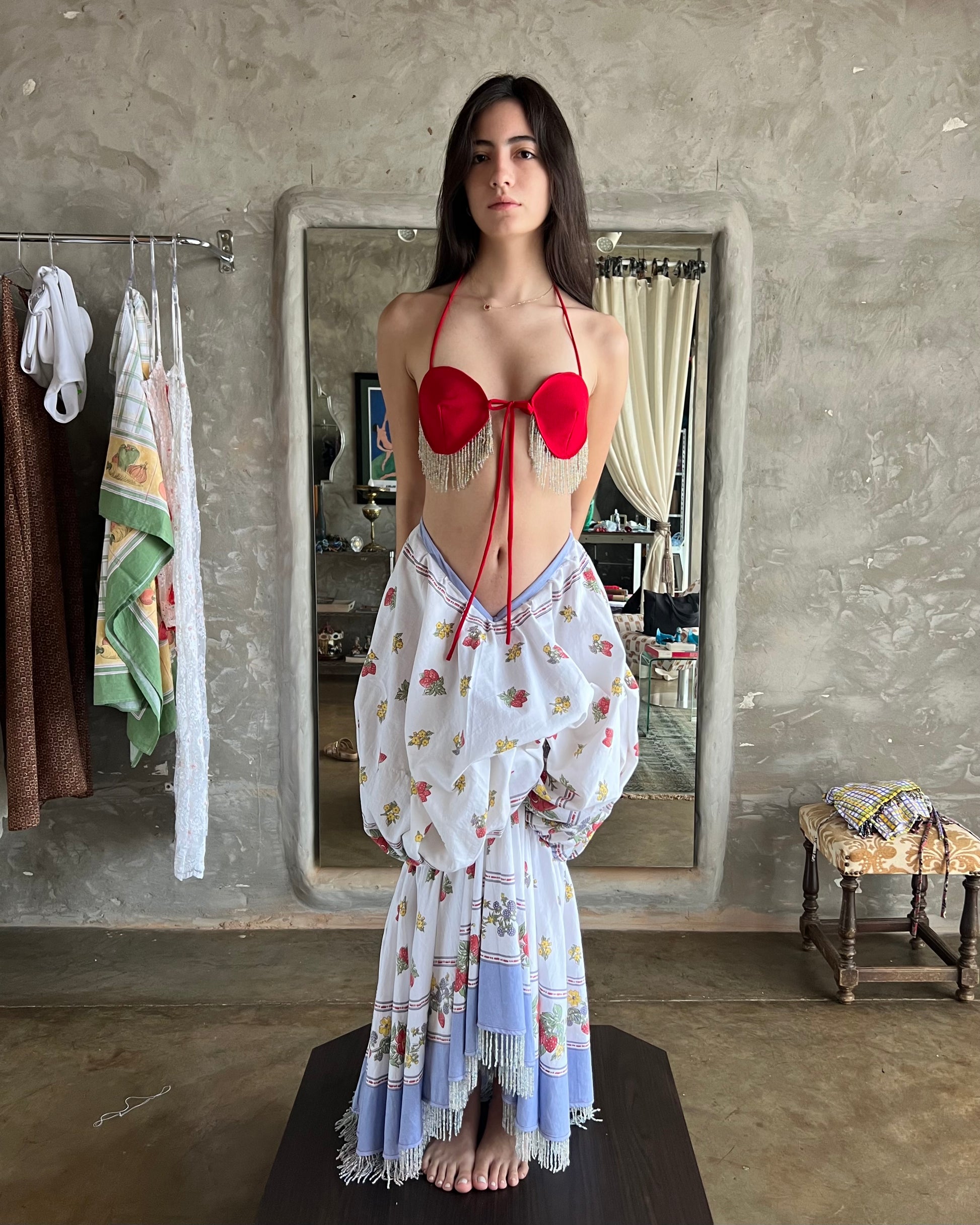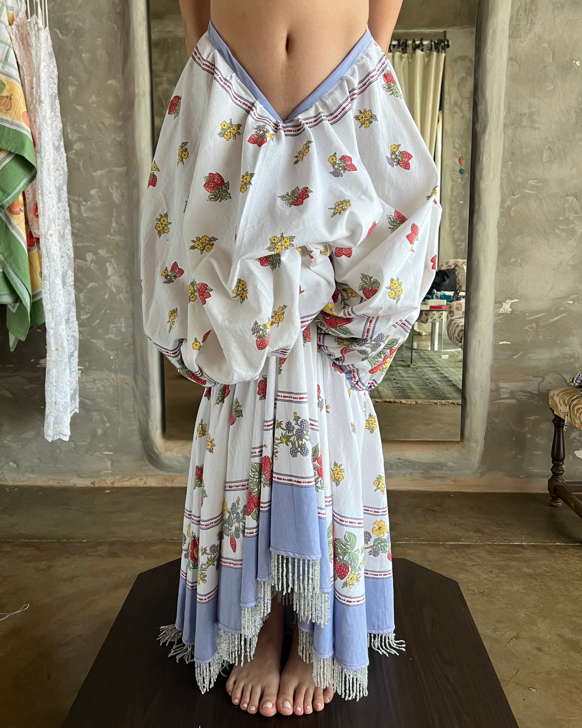 Erase una vez un mantel de comedor que se convirtió en la falda Copetin! Adornado con flecos de canutillos